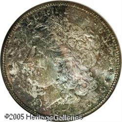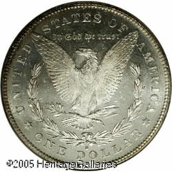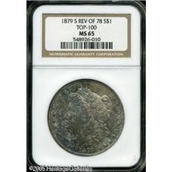 <B>1879-S<img border='0' src='http://www.heritagecoins.com/images/star.gif' width=10 height=10>$1 Reverse of 1878 MS65 NGC.</B></I> Top 100 Variety. The San Francisco Mint used a few leftover dies from its issue of 1878-S Morgan Dollars to produce an apparently limited number of 1879-S Reverse of 1878 examples. Most Mint State survivors trace their pedigree back to the 3,000-4,000 pieces found in the estate of LaVere Redfield, with virtually all of these coins being heavily abraded. Unlike the few Gem examples we have been lucky enough to offer, this well preserved representative is rather nicely toned. The obverse is overlaid in mottled olive-gray and lilac shades that allow full appreciation of the underlying luster. Population: 15 in 65, 0 finer (1/05). Lot:9954