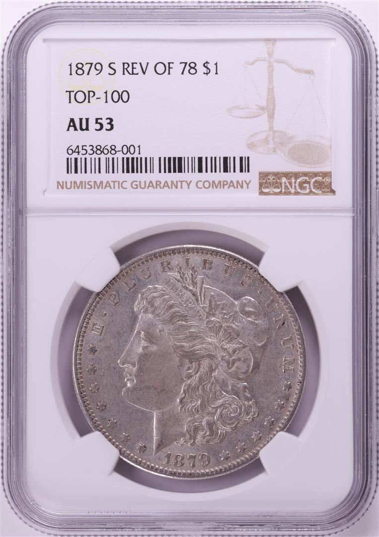 One 1879-S Reverse of 78 Top 100 $1 Morgan Silver Dollar Coin NGC AU53. NGC Certified.