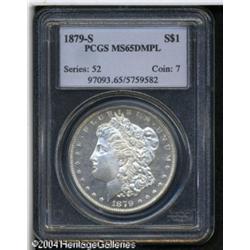 1879-S S$1 MS65 Deep Mirror Prooflike PCGS. A razo <B>1879-S S$1 MS65 Deep Mirror Prooflike PCGS.</B></I> A razor-sharp and prominently mirrored Gem, the frosty devices display only a hint of gold color. A couple of trivial slide marks on the cheek do not appear to limit the grade, and the eye appeal certainly exceeds its numerical designation. <BR><BR><B>Important notice:</B> Heritage usually auctions material at the rate of 200-250 lots per hour. On some occasions eBay Live bid software or the Internet may not be able to keep up with the pace of the auction. We recommend placing a realistic absentee bid now as insurance to avoid disappointment. Occasionally the auctioneer may eliminate or reject an eBay Live bid, and the auctioneer may also reopen a lot after the close of the eBay live bidding (usually because we missed an audience bid), and may reject your bid even if it shows you as the winning bidder. By bidding via eBay Live, you agree that Heritage may award the lot to another bidder at its sole discretion under the circumstances described above or any other reasonable circumstances. Since eBay bids are not shown to us until we open the lot on the floor, we treat those bids just like floor bids. In most cases the floor responds before the eBay bid is presented to us, due to Internet lag time, so for consistency we have made it a policy that floor bids are always considered first over tie eBay live bids. Also please note that all Heritage lots purchased through eBay Live carry a 20% Buyer's Premium. Please make sure you read the Terms and Conditions before you bid. This lot is being auctioned in conjunction with a live floor auction by Heritage Galleries & Auctioneers. All final auction and invoice information will be supplied by Heritage Galleries & Auctioneers, and all other information should be considered preliminary. Lot:7336