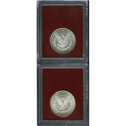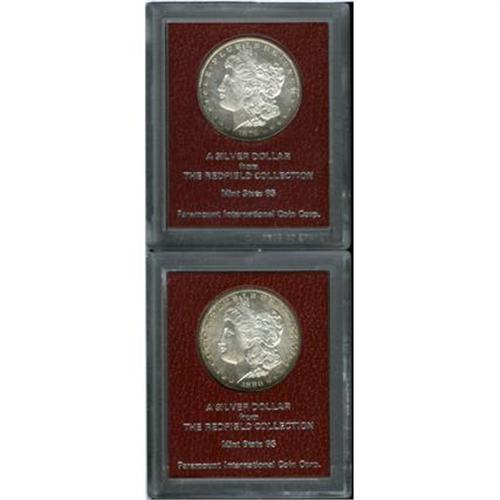 <B>1879-S<img border='0' src='http://www.heritagecoins.com/images/star.gif' width=10 height=10>$1> MS65 Paramount International (MS63),</B></I> ex: Redfield, semi-prooflike, peripheral rose patina; and an <B>1880-S MS65 Paramount International (MS63),</B></I> ex: Redfield, Medium S, golden-brown and aqua toning, fully lustrous and pleasing.