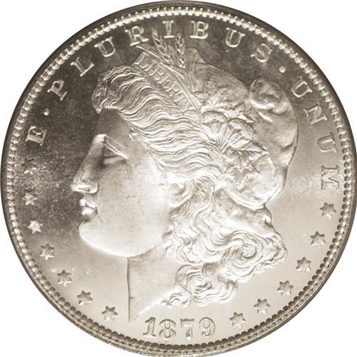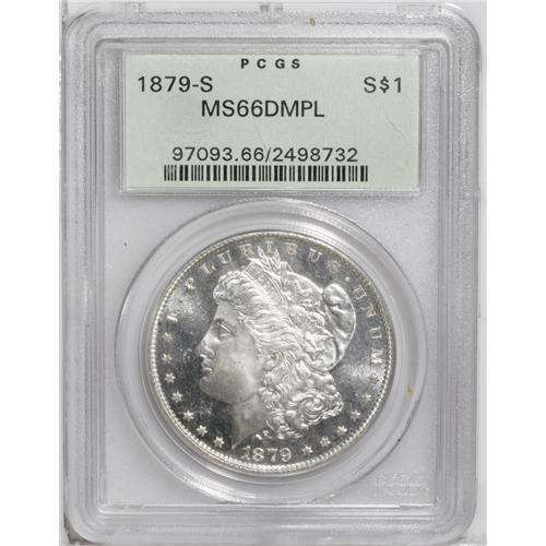 <B>1879-S<img border='0' src='http://www.heritagecoins.com/images/star.gif' width=10 height=10>$1> MS66 Deep Mirror Prooflike PCGS.</B></I> This Gem example exhibits flashy, deep mirrors, heavily frosted devices, a razor-sharp strike, and minimal contact marks. Housed in an early PCGS holder with a green insert. Population: 44 in 66 DMPL, 7 finer (7/06).