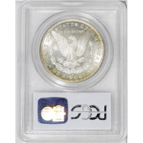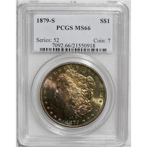 <B>1879-S<img border='0' src='http://www.heritagecoins.com/images/star.gif' width=10 height=10>$1> MS66 PCGS.</B></I> Pale champagne peripheral toning on the reverse is a faint echo of the surreal lemon-yellow and violet toning on the obverse, which forms a distinct canvas-bag pattern over much of Liberty's face. Sharply struck with great luster.
