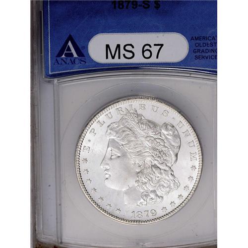 <B>1879-S<img border='0' src='http://www.heritagecoins.com/images/star.gif' width=10 height=10>$1> MS67 ANACS.</B></I> Wisps of hazy toning appear on the obverse of this otherwise brilliant coin. The devices are boldly struck and the surfaces are free of notable marks.