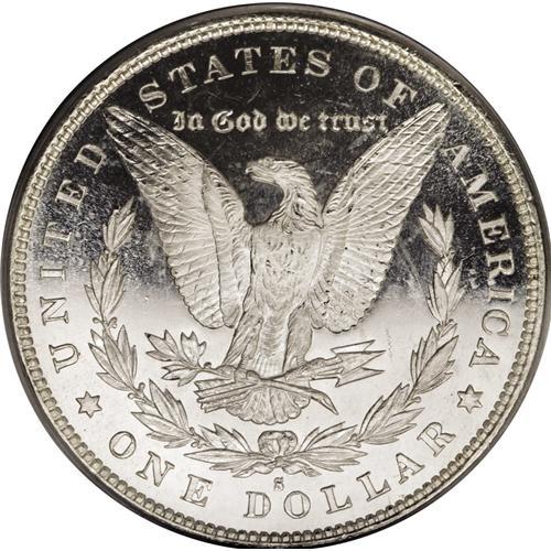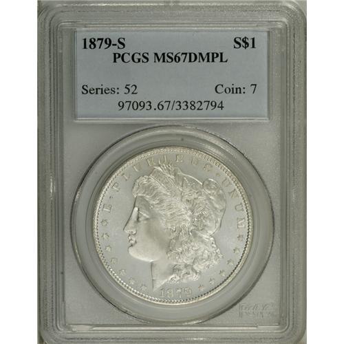 <B>1879-S S$1 MS67 Deep Mirror Prooflike PCGS.</B></I> This is a splendid Superb Gem with fully brilliant silver surfaces that exhibit nary a trace of toning on either side. It is fully struck throughout, including complete hair details over Liberty's ear and the eagle's breast feathers. The fields are fully mirrored around lustrous and frosty devices resulting in exquisite cameo contrast. The '79-S dollars are among the most common of all Morgan silver dollars and they are also among the best made, an excellent combination for the type collector who wants a single coin to illustrate the design. It is also the finest certified by PCGS, an excellent choice for the Set Registry collector.<BR><BR><b>Shipping:</b> Coin/Currency (<a target="_blank" href="http://www.heritageauctions.com/common/shipping.php">view shipping information</a>)