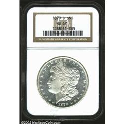 1879-S S$1 MS67 NGC. A gorgeous Superb Gem with imposing semi-prooflike fields and virtually pristine surface. A frosty and well struck Morgan Dollar. Important notice: We expect to be auctioning lots at the rate of 200-250 per hour. Sometimes eBay Premier live bid software cannot keep up with that pace, so we strongly recommend that you place a realistic proxy bid now as insurance to avoid disappointment. Also please note that all Heritage/CAA lots purchased through eBay Premier carry a 20% Buyer's Premium. Please make sure you read the Terms and Conditions.