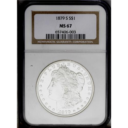 <B>1879-S<img border='0' src='http://www.heritagecoins.com/images/star.gif' width=10 height=10>$1> MS67 NGC.</B></I> Frosty luster endows each side of this nicely struck S-mint dollar. Essentially untoned surfaces are nicely preserved. NGC has seen 78 pieces grading finer (3/06). <BR><BR><B>Important notice:</B> Heritage usually auctions material at the rate of 200-250 lots per hour. On some occasions eBay Live bid software or the Internet may not be able to keep up with the pace of the auction. We recommend placing a realistic absentee bid now as insurance to avoid disappointment. Occasionally the auctioneer may eliminate or reject an eBay Live bid, and the auctioneer may also reopen a lot after the close of the eBay live bidding (usually because we missed an audience bid), and may reject your bid even if it shows you as the winning bidder. By bidding via eBay Live, you agree that Heritage may award the lot to another bidder at its sole discretion under the circumstances described above or any other reasonable circumstances. Since eBay bids are not shown to us until we open the lot on the floor, we treat those bids just like floor bids. In most cases the floor responds before the eBay bid is presented to us, due to Internet lag time, so for consistency we have made it a policy that floor bids are always considered first over tie eBay live bids. Also please note that all Heritage lots purchased through eBay Live carry a 20% Buyer's Premium. Please make sure you read the Terms and Conditions before you bid. This lot is being auctioned in conjunction with a live floor auction by Heritage Galleries & Auctioneers. All final auction and invoice information will be supplied by Heritage Galleries & Auctioneers, and all other information should be considered preliminary. Lot:3246 <BR><BR><B>Winning Notification and Billing:</B> After the FINAL session in this auction is complete, Heritage will send e-mail and snail mail invoices. This process normally takes several days. All final auction and invoice information will be supplied by Heritage Galleries & Auctioneers, and all other information should be considered preliminary. <BR><BR>This auction will be conducted on a live auction floor and over the Internet through eBay Live. If you choose to place an absentee bid, please take a moment to <font color='#0000ff'><u><a href='http://pages.ebay.com/liveauctions/help/before/laabsentee.html'>learn how eBay Live absentee bidding works</a></u></font><font color='#000000'>