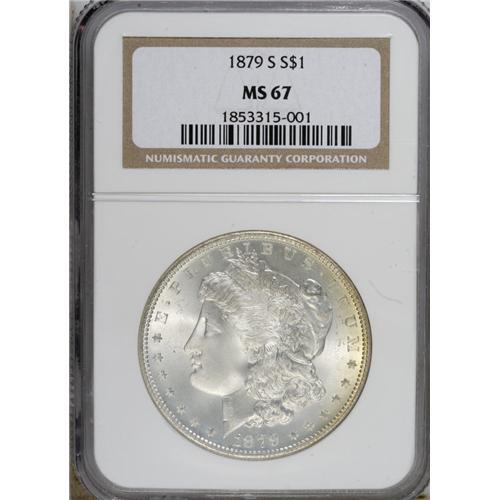 1879-S S$1 MS67 NGC. Strongly defined with vibrant lus