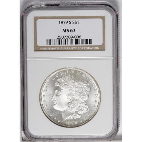 1879-S S$1 MS67 NGC. The lightly frosted devices are w