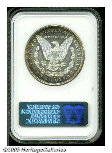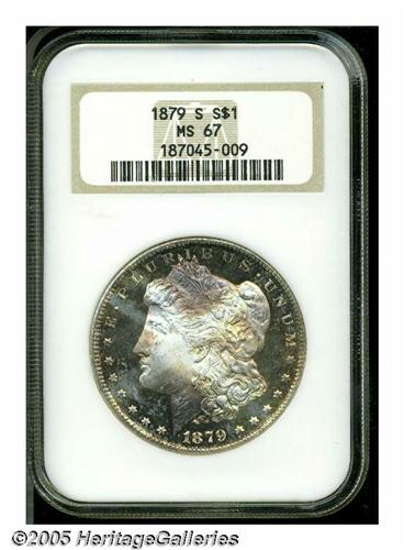 <B>1879-S<S$1> MS67 NGC.</B></I> This gorgeous '79-S shows mauve, golden-brown, and cobalt-blue toning interspersed among areas of brilliance. The design elements are sharply struck and mildly frosted, offering a nice contrast with nearly prooflike fields. The surfaces are seemingly devoid of significant contact marks. NGC has certified 64 pieces finer (6/05).