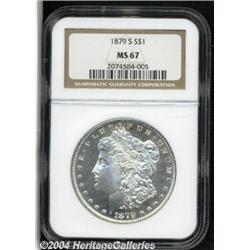 <B>1879-S<S$1> MS67 NGC.</B></I> This S-mint is exquisitely struck, with fully lustrous, essentially mark-free surfaces. Die polish lines (as made) occur in the fields. A very sharp Morgan dollar that will fit nicely into a high-grade collection. <BR><BR><B>Important notice:</B> Heritage usually auctions material at the rate of 200-250 lots per hour. On some occasions eBay Live bid software or the Internet may not be able to keep up with the pace of the auction. We recommend placing a realistic absentee bid now as insurance to avoid disappointment. Occasionally the auctioneer may eliminate or reject an eBay Live bid, and the auctioneer may also reopen a lot after the close of the eBay live bidding (usually because we missed an audience bid), and may reject your bid even if it shows you as the winning bidder. By bidding via eBay Live, you agree that Heritage may award the lot to another bidder at its sole discretion under the circumstances described above or any other reasonable circumstances. Since eBay bids are not shown to us until we open the lot on the floor, we treat those bids just like floor bids. In most cases the floor responds before the eBay bid is presented to us, due to Internet lag time, so for consistency we have made it a policy that floor bids are always considered first over tie eBay live bids. Also please note that all Heritage lots purchased through eBay Live carry a 20% Buyer's Premium. Please make sure you read the Terms and Conditions before you bid.