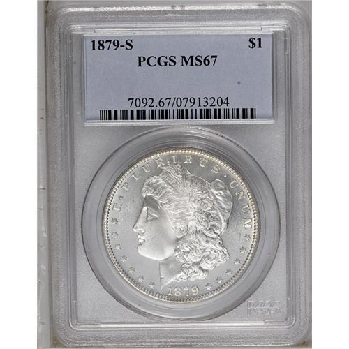 <B>1879-S<img border='0' src='http://www.heritagecoins.com/images/star.gif' width=10 height=10>$1> MS67 PCGS.</B></I> A flashy Superb Gem with intense luster and a needle-sharp strike. The magnificently preserved devices of this untoned example are lightly frosted.