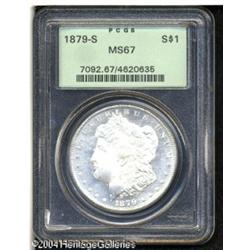 1879-S S$1 MS67 PCGS. A lovely semi-prooflike Supe <B>1879-S S$1 MS67 PCGS.</B></I> A lovely semi-prooflike Superb Gem that has frosty devices and outstanding preservation. Brilliant aside from a hint of tan color in the centers. Certified in a prior generation holder. <BR><BR><B>Important notice:</B> Heritage usually auctions material at the rate of 200-250 lots per hour. On some occasions eBay Live bid software or the Internet may not be able to keep up with the pace of the auction. We recommend placing a realistic absentee bid now as insurance to avoid disappointment. Occasionally the auctioneer may eliminate or reject an eBay Live bid, and the auctioneer may also reopen a lot after the close of the eBay live bidding (usually because we missed an audience bid), and may reject your bid even if it shows you as the winning bidder. By bidding via eBay Live, you agree that Heritage may award the lot to another bidder at its sole discretion under the circumstances described above or any other reasonable circumstances. Since eBay bids are not shown to us until we open the lot on the floor, we treat those bids just like floor bids. In most cases the floor responds before the eBay bid is presented to us, due to Internet lag time, so for consistency we have made it a policy that floor bids are always considered first over tie eBay live bids. Also please note that all Heritage lots purchased through eBay Live carry a 20% Buyer's Premium. Please make sure you read the Terms and Conditions before you bid. This lot is being auctioned in conjunction with a live floor auction by Heritage Galleries & Auctioneers. All final auction and invoice information will be supplied by Heritage Galleries & Auctioneers, and all other information should be considered preliminary. Lot:7333