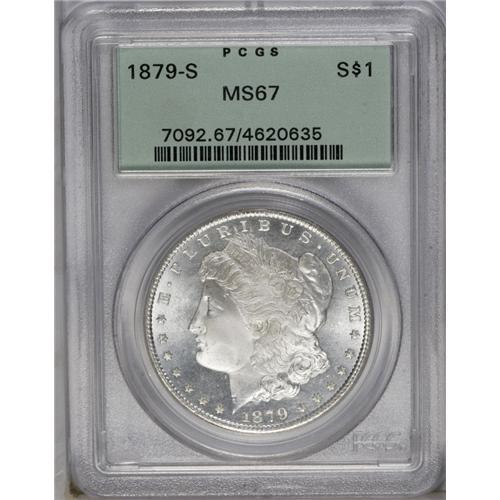 <B>1879-S<img border='0' src='http://www.heritagecoins.com/images/star.gif' width=10 height=10>$1> MS67 PCGS.</B></I> Heavily frosted and sharply struck devices contrast with mostly brilliant, somewhat reflective surfaces; both are in near-immaculate states of preservation. Encapsulated in a green label holder.<BR><I>From The Chicago-Ark Collection.</B></I>