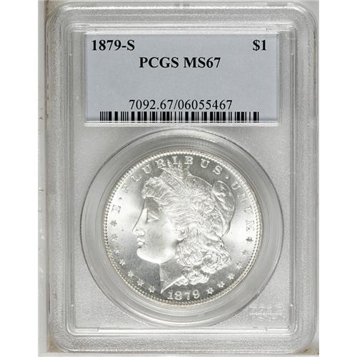 <B>1879-S<img border='0' src='http://www.heritagecoins.com/images/star.gif' width=10 height=10>$1> MS67 PCGS.</B></I> Mostly brilliant with tiny dots of dark toning on the eagle. A boldly struck and highly lustrous piece with magnificently preserved surfaces.