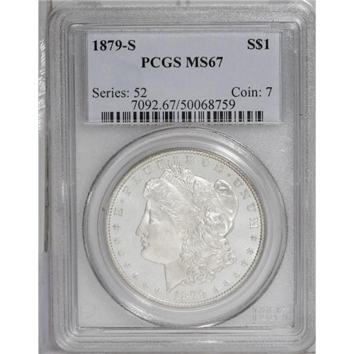 <B>1879-S<img border='0' src='http://www.heritagecoins.com/images/star.gif' width=10 height=10>$1> MS67 PCGS.</B></I> The reverse may not be prooflike, but the obverse is! Liberty's head is deeply frosted and the seemingly bottomless mirrors have pale, thin toning. This Superb Gem has great eye appeal, and as a one-sided prooflike, it represents an incredible bargain.<BR><I>From The New York Eye Appeal Collection.</B></I>