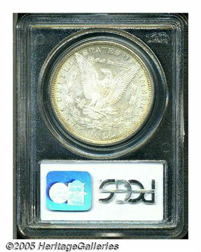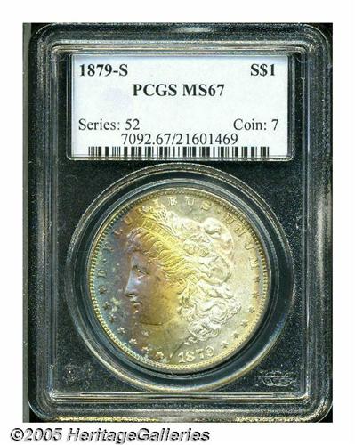 <B>1879-S<S$1> MS67 PCGS.</B></I> Well struck and very nearly pristine, with pleasingly frosty luster and luxurious electric-blue, purple-red, and gold toning on the left side of the obverse. A remarkably beautiful Superb Gem.