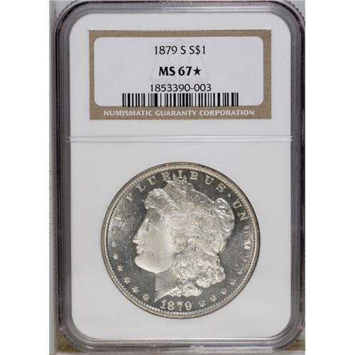 <B>1879-S S$1 MS67 <img border='0' src='http://www.heritagecoins.com/images/star.gif' width=10 height=10> NGC.</B></I> The obverse is rather prooflike, which no doubt inspired the Star designation from NGC. The reverse is merely semi-prooflike. A brilliant and beautiful Superb Gem that has the penetrating strike usual for the '79-S. The mintmark is nicely repunched.<BR><BR><b>Shipping:</b> Coins & Currency (<a target="_blank" href="http://www.heritageauctions.com/common/shipping.php">view shipping information</a>)