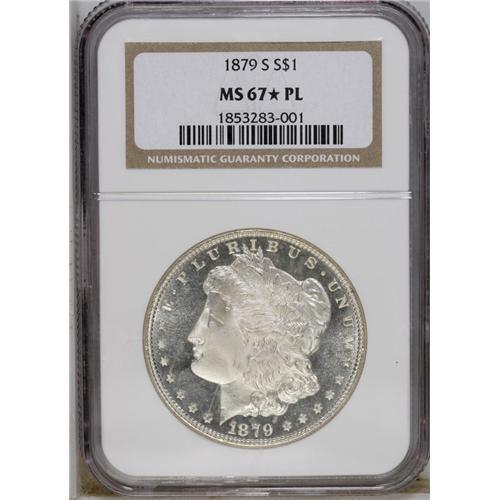 <B>1879-S S$1 MS67 <img border='0' src='http://www.heritagecoins.com/images/star.gif' width=10 height=10> Prooflike NGC.</B></I> The obverse reflectivity is exceptional, though the reverse is "merely" Prooflike. Slightly hazy with strong detail on the portrait, which has a blush of rose. Census: 67 in 67, 4 finer (12/06).<BR><BR><b>Shipping:</b> Coins & Currency (<a target="_blank" href="http://www.heritageauctions.com/common/shipping.php">view shipping information</a>)