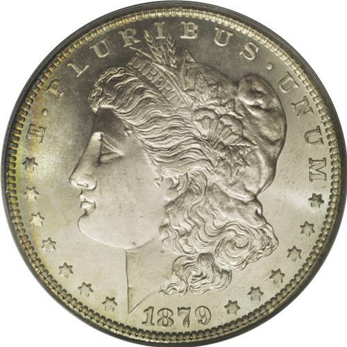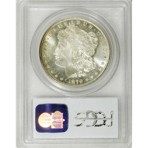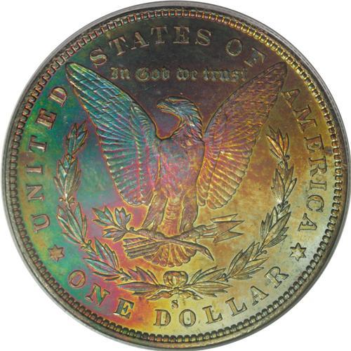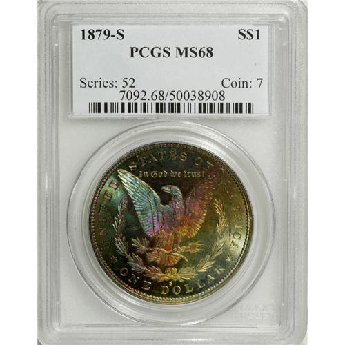 <B>1879-S S$1 MS68 PCGS.</B></I> While the surfaces are extraordinarily clean with the lustrous surfaces one expects, this coin's strong suit is derived from its spectacular reverse toning, explaining why it is encapsulated reverse-up. The entire reverse is shaded from deep emerald-green to crimson to yellow-gold in a fantastic panoply of coloration. The obverse is almost brilliant with just the slightest hint of color along the left rim. The design elements on both sides are fully struck, and the surfaces exhibit slight evidence of a mirrored or prooflike finish. Population: 69 in 68, 0 finer (2/07).<BR><I>From The Jackson Hole Collection.</B></I><BR><BR><b>Shipping:</b> Coins & Currency (<a target="_blank" href="http://www.heritageauctions.com/common/shipping.php">view shipping information</a>)