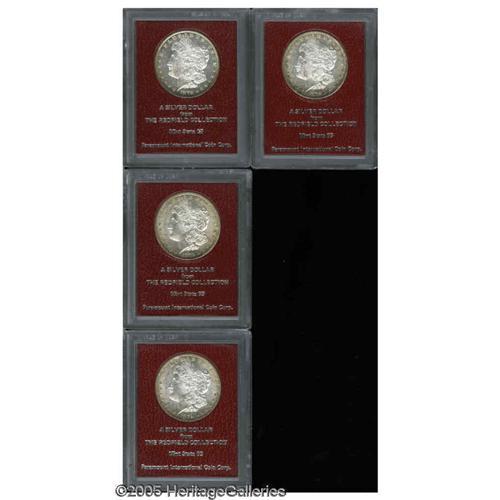 <B>1879-S<S$1> Morgan Dollar MS65 Paramount International (MS62),</B></I> Ex: Redfield, flashy fields, golden-brown and aqua color at the borders; <B>1879-S Morgan Dollar MS65 Paramount International (MS62),</B></I> Ex: Redfield, honey-brown and apple-green freckles near the margins, a splendid reverse; <B>1879-S Morgan Dollar MS65 Paramount International (MS62),</B></I> Ex: Redfield, a semi-prooflike piece with unmarked fields and only faint gold toning; and an <B>1879-S Morgan Dollar MS65 Paramount International (MS63),</B></I> Ex: Redfield, highly lustrous, walnut-brown toning hugs the borders.