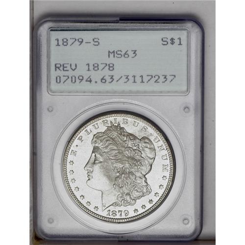<B>1879-S<img border='0' src='http://www.heritagecoins.com/images/star.gif' width=10 height=10>$1> Reverse of 1878 MS63 PCGS.</B></I> Faint tan toning adorns this lustrous and crisply struck example. Minor contact on the cheek does not appear to limit the grade. Housed in an early generation holder.