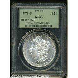 <B>1879-S<S$1> Reverse of 1878 MS63 PCGS.</B></I> Bright luster abounds over both sides of this sharply struck S-mint issue. The surfaces are essentially untoned, and reveal a few light abrasions on Liberty's face that limit the grade. <BR><BR><B>Important notice:</B> Heritage usually auctions material at the rate of 200-250 lots per hour. On some occasions eBay Live bid software or the Internet may not be able to keep up with the pace of the auction. We recommend placing a realistic absentee bid now as insurance to avoid disappointment. Occasionally the auctioneer may eliminate or reject an eBay Live bid, and the auctioneer may also reopen a lot after the close of the eBay live bidding (usually because we missed an audience bid), and may reject your bid even if it shows you as the winning bidder. By bidding via eBay Live, you agree that Heritage may award the lot to another bidder at its sole discretion under the circumstances described above or any other reasonable circumstances. Since eBay bids are not shown to us until we open the lot on the floor, we treat those bids just like floor bids. In most cases the floor responds before the eBay bid is presented to us, due to Internet lag time, so for consistency we have made it a policy that floor bids are always considered first over tie eBay live bids. Also please note that all Heritage lots purchased through eBay Live carry a 20% Buyer's Premium. Please make sure you read the Terms and Conditions before you bid.