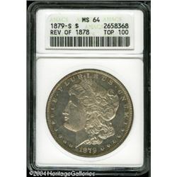 1879-S S$1 Reverse of 1878 MS64 ANACS. VAM-43. A T <B>1879-S S$1 Reverse of 1878 MS64 ANACS.</B></I> VAM-43. A Top 100 Variety. An attractive layer of lime-green and golden-red color blankets the reverse, the obverse presents a bright silver-gray appearance. Well struck and minimally marked for the grade. <BR><BR><B>Important notice:</B> Heritage usually auctions material at the rate of 200-250 lots per hour. On some occasions eBay Live bid software or the Internet may not be able to keep up with the pace of the auction. We recommend placing a realistic absentee bid now as insurance to avoid disappointment. Occasionally the auctioneer may eliminate or reject an eBay Live bid, and the auctioneer may also reopen a lot after the close of the eBay live bidding (usually because we missed an audience bid), and may reject your bid even if it shows you as the winning bidder. By bidding via eBay Live, you agree that Heritage may award the lot to another bidder at its sole discretion under the circumstances described above or any other reasonable circumstances. Since eBay bids are not shown to us until we open the lot on the floor, we treat those bids just like floor bids. In most cases the floor responds before the eBay bid is presented to us, due to Internet lag time, so for consistency we have made it a policy that floor bids are always considered first over tie eBay live bids. Also please note that all Heritage lots purchased through eBay Live carry a 20% Buyer's Premium. Please make sure you read the Terms and Conditions before you bid. This lot is being auctioned in conjunction with a live floor auction by Heritage Galleries & Auctioneers. All final auction and invoice information will be supplied by Heritage Galleries & Auctioneers, and all other information should be considered preliminary. Lot:7338