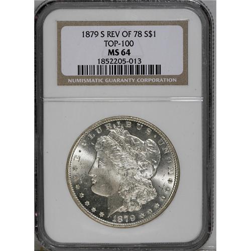 <B>1879-S<img border='0' src='http://www.heritagecoins.com/images/star.gif' width=10 height=10>$1> Reverse of 1878 MS64 NGC.</B></I> Top 100 Variety. Bright, lustrous surfaces with virtually no color on either side. A typically abraded example of this scarcer variety.