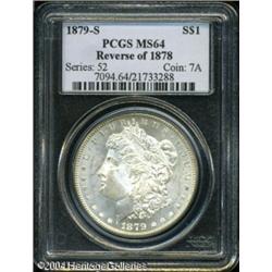 1879-S S$1 Reverse of 1878 MS64 PCGS. Bright, near <B>1879-S S$1 Reverse of 1878 MS64 PCGS.</B></I> Bright, nearly untoned surfaces whose fields reveal some prooflike characteristics. Nicely struck, save for the hair above Liberty's ear. Minute marks and luster grazes on Liberty's face and neck, and in the left obverse field, limit the grade. <BR><BR><B>Important notice:</B> Heritage usually auctions material at the rate of 200-250 lots per hour. On some occasions eBay Live bid software or the Internet may not be able to keep up with the pace of the auction. We recommend placing a realistic absentee bid now as insurance to avoid disappointment. Occasionally the auctioneer may eliminate or reject an eBay Live bid, and the auctioneer may also reopen a lot after the close of the eBay live bidding (usually because we missed an audience bid), and may reject your bid even if it shows you as the winning bidder. By bidding via eBay Live, you agree that Heritage may award the lot to another bidder at its sole discretion under the circumstances described above or any other reasonable circumstances. Since eBay bids are not shown to us until we open the lot on the floor, we treat those bids just like floor bids. In most cases the floor responds before the eBay bid is presented to us, due to Internet lag time, so for consistency we have made it a policy that floor bids are always considered first over tie eBay live bids. Also please note that all Heritage lots purchased through eBay Live carry a 20% Buyer's Premium. Please make sure you read the Terms and Conditions before you bid. This lot is being auctioned in conjunction with a live floor auction by Heritage Galleries & Auctioneers. All final auction and invoice information will be supplied by Heritage Galleries & Auctioneers, and all other information should be considered preliminary. Lot:7337