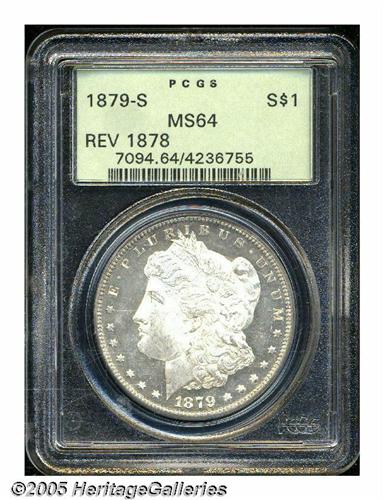 <B>1879-S<S$1> Reverse of 1878 MS64 PCGS.</B></I> Highly attractive example with prooflike obverse surfaces. The obverse is free of serious abrasions, but some looping pin scratches are seen on the reverse near the arrowheads.