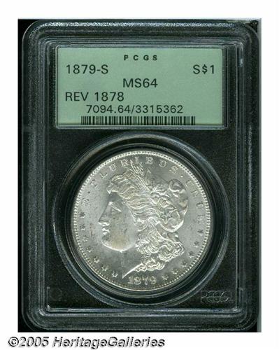 <B>1879-S<S$1> Reverse of 1878 MS64 PCGS.</B></I> Lustrous and fully struck. A minimally abraded, attractive example of this scarcer variety, of which the majority of mint state coins grade MS62 or less.
