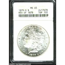 1879-S S$1 Reverse of 1878 MS65 ANACS. A Top 100 Variety. The Flat Breast 1879-S has long been recognized as a conditionally challenging issue among early Morgan Dollars. Generally heavily bagmarked, very few coins attain a Gem grade from one of the major certification services. This piece is brilliant throughout and sharply struck with bright, semi-prooflike fields. Only a few light luster grazes are seen on the face of Liberty. Important notice: We expect to be auctioning lots at the rate of 200-250 per hour. On occasion eBay live bid software cannot keep up with the pace of the auctions where 4-5 lots per minute can hammer down, so we recommend that you place a realistic absentee bid now as insurance to avoid disappointment. Also please note that all Heritage/CAA lots purchased through eBay Live carry a 20% Buyer's Premium. Please make sure you read the Terms and Conditions.