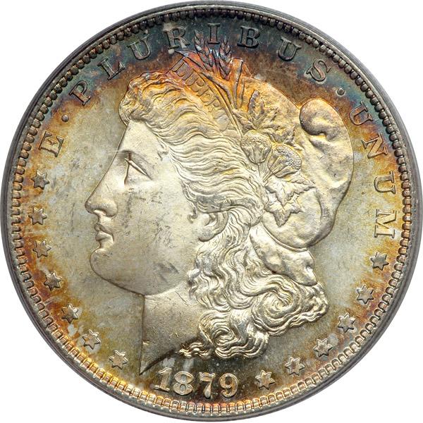 1879-S. PCGS graded MS-64+. Lovely blue and golden toning about the borders and certainly a Premium Quality coin for the grade (PCGS # 7092) .