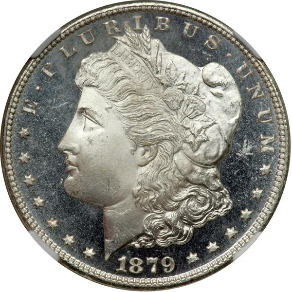 1879-S. NGC graded MS-67. Star. Fully white and sparkling with reflective obverse fields. Pop 141; 6 finer in 68 (PCGS # 7092) .