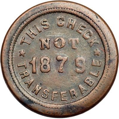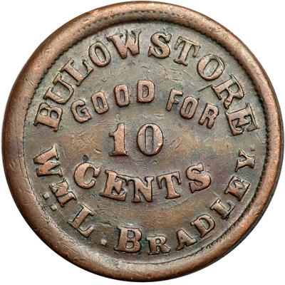 1879 South Carolina Merchant Token for Wm. L. Bradley 10 Cents Rulau SC-St 7. VF-30. Choice glossy chocolate and light olive brown. Smooth and quite attractive for the grade, just a bit of wear on the devices. The legends are complete and strong. A very rare token from this store in Stono, South Carolina.