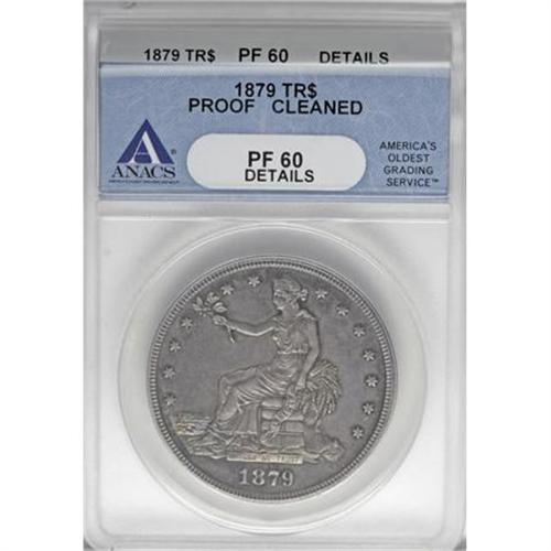 <B>1879 T$1 --Cleaned--ANACS. PR60 Details.</B></I> In 1879, the year the Trade dollar went to proof-only production, Philadelphia produced 1,541 pieces. This specimen shows blue and violet patina with a measure of iridescence on the obverse, though the purple-gray reverse is dulled from a past cleaning.<BR><BR><B>Coin Engraver:</B> William Barber<BR><BR><b>Shipping:</b> Coins & Currency (<a target="_blank" href="http://www.heritageauctions.com/common/shipping.php">view shipping information</a>)