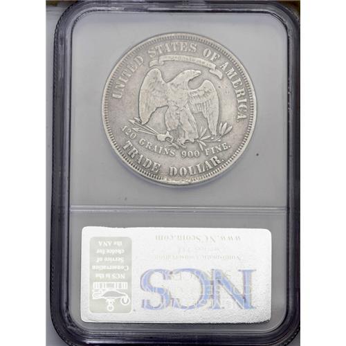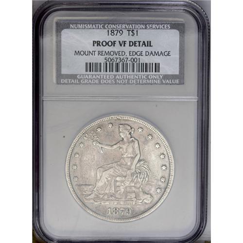 <B>1879<T$1>--Mount Removed, Edge Damage--NCS. VF Details.</B></I> This scarce proof-only Trade dollar is polished, and portions of the fields and rims are tooled with pinscratches. Likely once affixed to jewelry at 12 o'clock on the obverse and 6 o'clock on the reverse.