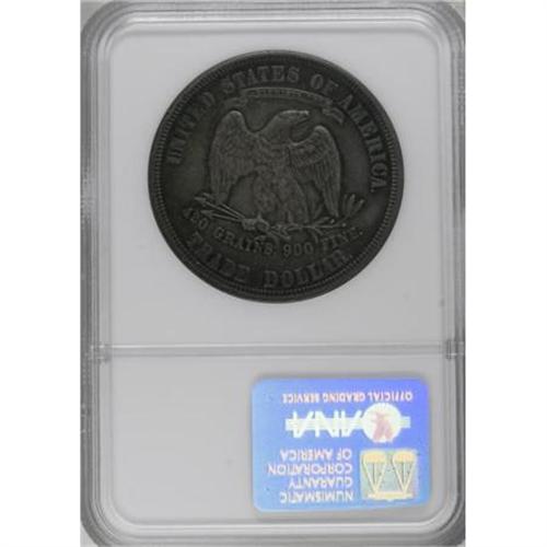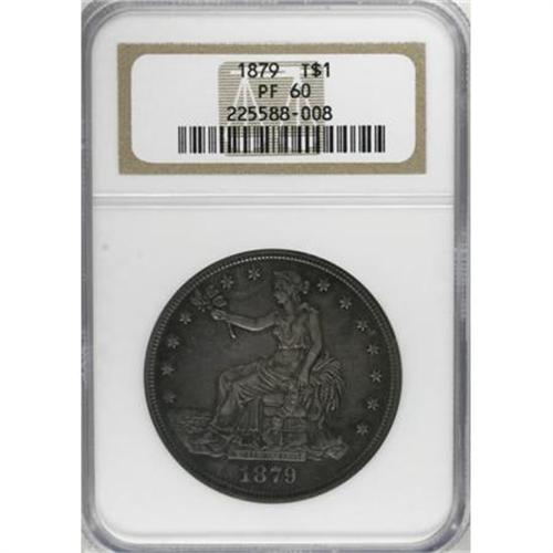 <B>1879 T$1 PR60 NGC.</B></I> Boldly impressed with dusky blue-gray and violet surfaces. Though the devices show no evidence of rub, extensive hairlines and a handful of pinscratches affect the fields. Still, an interesting representative of this proof-only issue.<BR><BR><B>Coin Engraver:</B> William Barber<BR><BR><b>Shipping:</b> Coins & Currency (<a target="_blank" href="http://www.heritageauctions.com/common/shipping.php">view shipping information</a>)