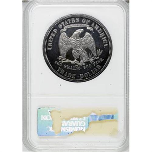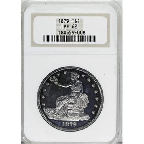 <B>1879 T$1 PR62 NGC.</B></I> Fully struck with watery, dark fields and lightly frosted devices. A pinscratch on the upper right obverse, from the rim to the back of Liberty's head, and a few wispy field hairlines limit the grade. First of the proof-only issues at the end of the Trade dollar series. <BR><I>From The Vanek Collection.</B></I><BR><BR><b>Shipping:</b> Coins & Currency (<a target="_blank" href="http://www.heritageauctions.com/common/shipping.php">view shipping information</a>)
