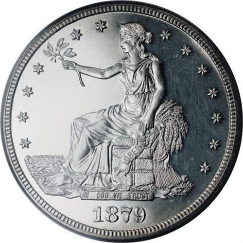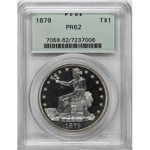 <B>1879 T$1 PR62 PCGS.</B></I> This proof-only Trade dollar offers consistent white-on-black contrast. It is uncertified as Cameo, as it is housed in a green label holder. A brilliant specimen that boasts a razor-sharp strike and a well preserved reverse. Wispy obverse hairlines decide the grade.<BR><BR><B>Coin Engraver:</B> William Barber<BR><BR><b>Shipping:</b> Coins & Currency (<a target="_blank" href="http://www.heritageauctions.com/common/shipping.php">view shipping information</a>)
