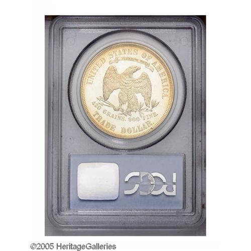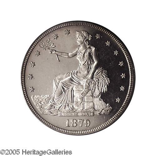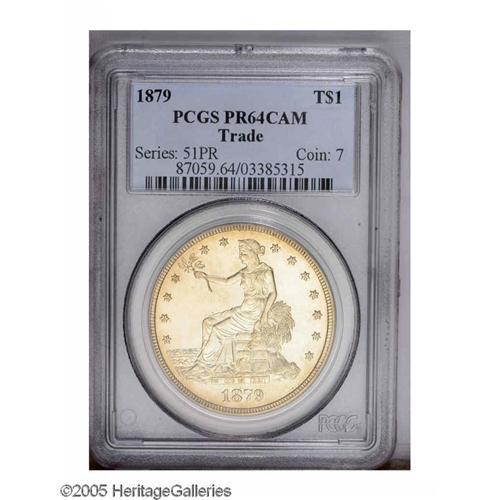 <B>1879<T$1> PR64 Cameo PCGS.</B></I> Essentially untoned with only the wispiest hairlines in the glassy fields and appreciable contrast. An impressive Proof Trade Dollar that is certain to please the potential buyer. Population: 24 in 64 Cameo, 21 finer (11/05).