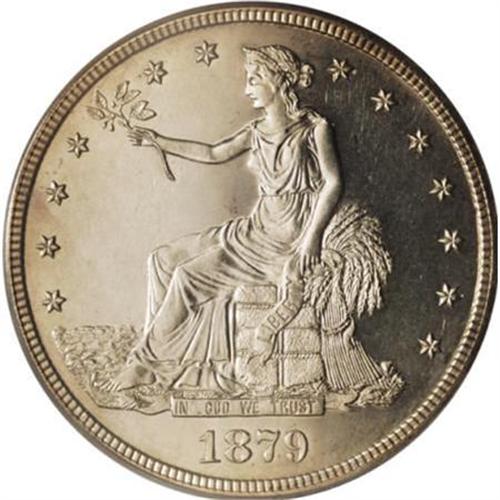 <B>1879 T$1 PR64 Cameo PCGS.</B></I> A popular, proof-only date with a mintage of 1,541 pieces. This is an attractive, upper-end PR64 that shows a significant amount of contrast between the frosted devices and deeply reflective proof fields. A few light hairlines account for the less-than-Gem grade. Mostly brilliant, there is just a hint of light golden-rose color on each side.<BR><BR><b>Shipping:</b> Coins & Currency (<a target="_blank" href="http://www.heritageauctions.com/common/shipping.php">view shipping information</a>)