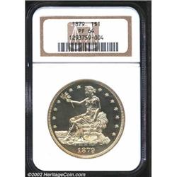 1879 T$1 PR64 NGC. This coin was struck from Bowers' "First Variety," with an imperfect 8 in the date and the left side of the 7 under the E in WE, just right of center. This is an immensely popular date among collectors who specialize in this series, as 1879 represents the first year in which the Trade Dollar was delivered solely in proof format. A bright, golden tinged near-Gem, the present survivor is fully struck with a uniformly reflective finish on the obverse. There is some light mint frost over the reverse devices, and the surfaces are a few wispy, barely perceptible hairlines away from full Gem status.From the Andy Geosits Collection of Trade Dollars. Important notice: We expect to be auctioning lots at the rate of 200-250 per hour. Sometimes eBay Premier live bid software cannot keep up with that pace, so we strongly recommend that you place a realistic proxy bid now as insurance to avoid disappointment. Also please note that all Heritage/CAA lots purchased through eBay Premier carry a 20% Buyer's Premium. Please make sure you read the Terms and Conditions.