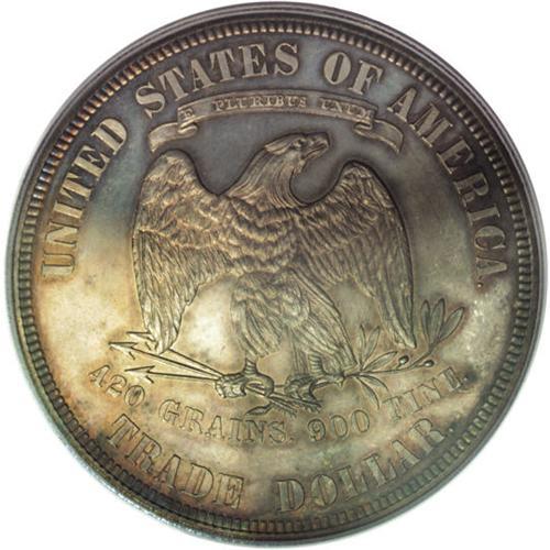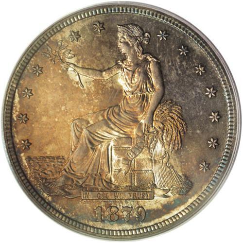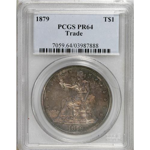 <B>1879 T$1 PR64 PCGS.</B></I> David Bowers indicates that most specimens of the 1879 proof-only Trade dollar were saved, but with "varying degrees of care." This near-Gem example displays dusky golden-brown, cobalt-blue, and lavender toning, which is somewhat more extensive on the obverse. Some unobtrusive hairlines mingle with die polish lines.<BR><BR><b>Shipping:</b> Coins & Currency (<a target="_blank" href="http://www.heritageauctions.com/common/shipping.php">view shipping information</a>)