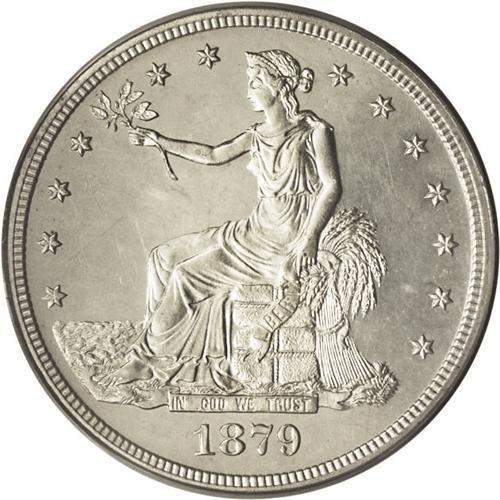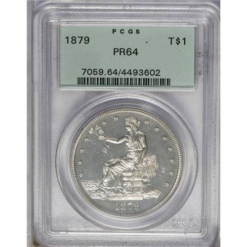 <B>1879<T$1> PR64 PCGS.</B></I> This example has exceptional reflectivity and some cameo contrast. A boldly impressed piece with pale champagne patina that has faint hairlines in the obverse fields, though the overall eye appeal is high. Housed in a green label holder.<BR><I>From The Antigo Collection.</B></I>
