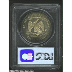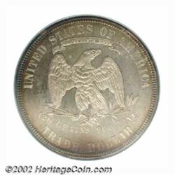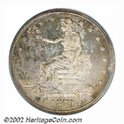 1879 T$1 PR64 PCGS. Glassy fields and fully brought up devices shine powerfully through mottled olive and silver-gray patina. Some more vibrant iridescence has gathered over these base colors, with crimson, orange-gold, and electric-blue accents at the rims being of particular note. The hairlines that account for the PR64 designation must be well concealed by the toning because the outward appearance of this specimen is that of a Gem. The Philadelphia Mint delivered only 1,541 Trade Dollars in 1879, all of which were proofs. Important notice: We expect to be auctioning lots at the rate of 200-250 per hour. Sometimes eBay Premier live bid software cannot keep up with that pace, so we strongly recommend that you place a realistic proxy bid now as insurance to avoid disappointment. Also please note that all Heritage/CAA lots purchased through eBay Premier carry a 20% Buyer's Premium. Please make sure you read the Terms and Conditions.