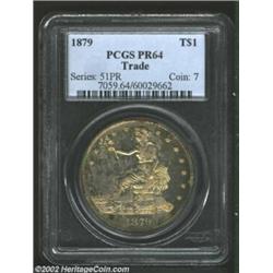 1879 T$1 PR64 PCGS. Glassy fields and fully brought up devices shine powerfully through mottled oliv