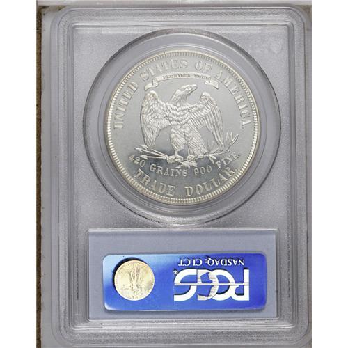<B>1879<T$1> PR64 PCGS.</B></I> The large, open fields of the Trade dollar design display the deep, watery mirrors of this example. Boldly struck with mostly pearl-gray surfaces accented gold-olive near the periphery. A small blemish to the right of the date is the only immediately visible flaw on this near-Gem specimen.