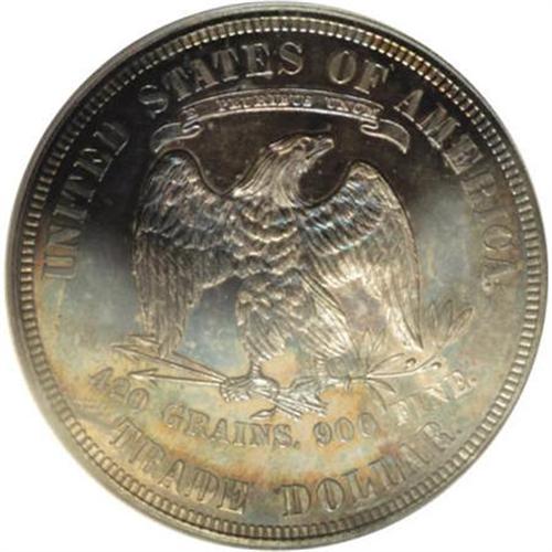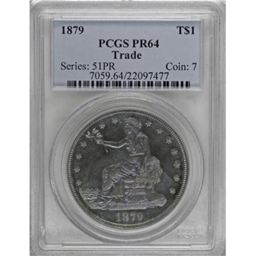 <B>1879 T$1 PR64 PCGS.</B></I> The second proof-only issue in the series, the 1879 had the second highest mintage of any proof trade dollar with a production of 1,541 coins. This near-Gem proof has deep blue and iridescent toning on both sides, with fully mirrored fields beneath. Apparent cameo contrast is also evident, although the toning prevents such a designation by the grading service.<I><BR>From The Beau Clerc Collection.</B></I><BR><BR><B>Coin Engraver:</B> William Barber<BR><BR><b>Shipping:</b> Coins & Currency (<a target="_blank" href="http://www.heritageauctions.com/common/shipping.php">view shipping information</a>)