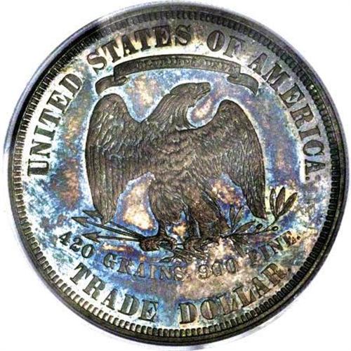 <B>1879 T$1 PR64 PCGS.</B></I> This proof-only issue comes from a mintage of 1,541 pieces. Mirrored fields highlight the motifs when the piece is rotated beneath a light source. Iridescent cobalt-blue toning adheres to the areas around and the interstices of the design elements, contrasting with the remaining golden-gray and lavender surfaces. An impressive strike emboldens the devices, and a few minor handling marks in the fields define the grade.<BR><BR><B>Coin Engraver:</B> William Barber<BR><BR><b>Shipping:</b> Coins & Currency (<a target="_blank" href="http://www.heritageauctions.com/common/shipping.php">view shipping information</a>)